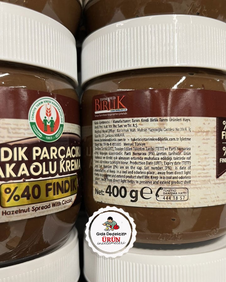 Tarım Kredi Kooperatif markasıyla takipçilerimizin dikkatini çeken ve incelememiz için tarafımıza gönderdikleri yeni bir ürünü; Tarım Kredi Birlik Fındık Parçacıklı Kakaolu Krema’yı inceliyoruz. 400 gr.’lık cam kavanozlarda satılan ürün ambalajı üzerindeki “%40 fındık” ifadesiyle dikkat çekiyor. Ürünün Trabzon Tarım A.Ş. firması tarafından Tarım Kredi Birlik için fason olarak üretildiğini söyleyelim. Üretici bilgisi ambalaj üzerinde tüketiciye açık olarak beyan edilmiyor, ürünün Tarım Kredi Birlik tarafından üretildiği algısı oluşuyor.