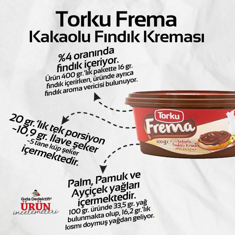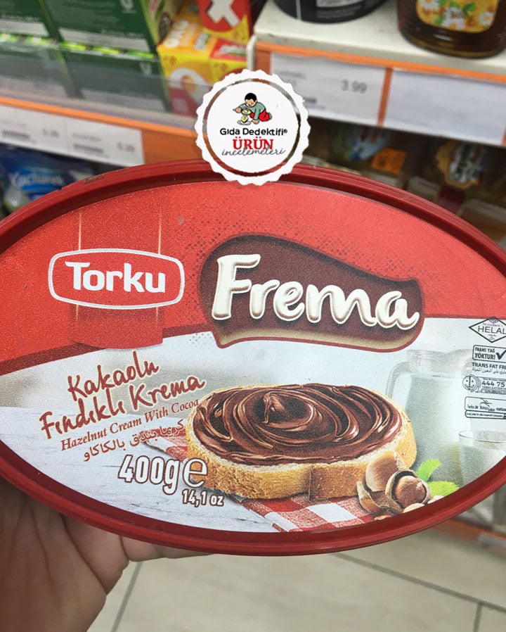 Bundan birkaç yıl önce Torku’nın Kakaolu Fındık Kreması markası olan Banada’nın yanı sıra ürettiği Frema ile tanışmış, neden böyle bir marka farkı olduğunu merak etmiştik. Fakat ürünün içeriğine baktığımızda Torku’nun daha düşük profilli bir ürün alternatifi ürettiğini anlamıştık. Öyle ki, o zamanlar Frema’da sadece %2 oranında fındık yer alıyordu. Bugün incelediğimiz Torku Frema ürününde fındık oranı %2’den %4’e çıkartılırken, süttozu oranın düşürüldüğünü ve ayrıca şeker oranının da arttırıldığını anlıyoruz. Torku Frema ürününü 400 gr.’lık plastik ambalajı üzerinden inceliyoruz.