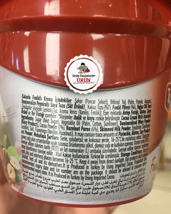 🔎İçindekiler: Şeker, Bitkisel yağ (Palm, Pamuk, Ayçiçek), Demineralize Peynir altı suyu tozu, Kakao tozu (%7), Fındık Püresi (%4), Yağsız süt tozu, Emülgatör (Ayçiçek Lesitini), Tuz, Aroma verici (Vanilin, Fındık)