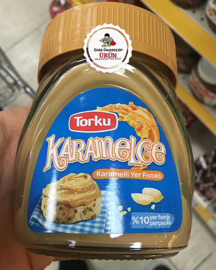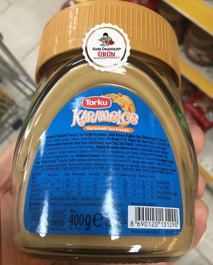 Torku tarafından piyasaya sürülen ve içeriğinde çok sayıda katkı maddesinin yanında Eti’nin çok meşhur dörtlü bitkisel yağlarını da içeren bir ürününü inceleyeceğiz: Torku Karamelce Karamelli Yer Fıstıklı Sütlü Krema. Ürün 400 gr.’lık cam kavanozlara satılıyor. Üründe sütlü krema ifadesi yer alsa da, bahsi geçen “krema” sütten değil, palm yağı başta olmak üzere bitkisel yağlardan geliyor. Üründe yağsız süttozu bulunuyor. Ürün Konya Şeker Fabrikaları’nda üretiliyor.