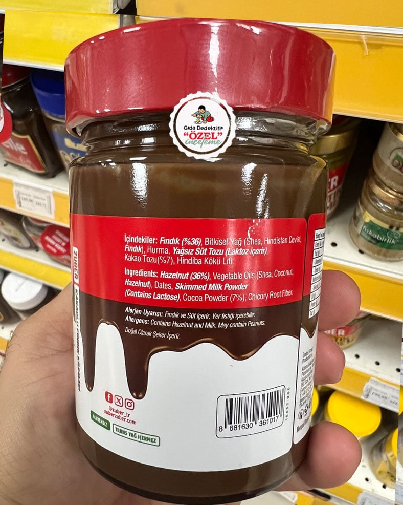 🔍İçindekiler: Fındık (%36), Bitkisel yağ (Shea, Hindistan Cevizi, Fındık), Hurma, Yağsız süttozu, Kakao tozu (%7), Hindiba kökü lifi