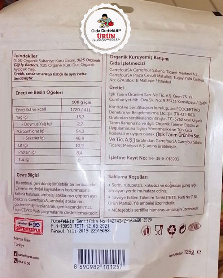 🔎Carrefour Bio Organik Kuruyemiş Karışımı Besin Değerleri