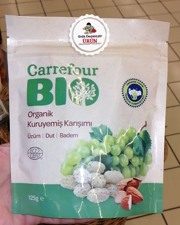 İlk olarak çok fazla rastlamadığımız organik bir kuruyemiş ve kurumeyve karışımıyla başlayacağız; Carrefour Bio Organik Kuruyemiş Karışımı. Ürün 40 gr. ve 125 gr.’lık iki farklı ambalajıyla raflarda yer alıyor. Ürünün Işık Tarım Ürünleri tarafından Carrefoursa adına üretildiğini görüyoruz. Ürünün ECOCERT firması tarafından organik tarım mevzuatına uygun sertifikalandırıldığını da söyleyelim. Ürün içeriğinde %50 oranında Organik Sultaniye Kuru üzümü ve %25 oranında Organik Datça İç Bademi yer alıyor. Bugünlerde özellikle ABD’den ithal bademlerin piyasada çokça yer aldığını biliyoruz – ki bu haliyle ürünün hem organik oluşu hem de yerli mamulleri içeriyor olması pek de rastladığımız bir şey değil. Üründe ayrıca %25 oranında da Organik Kuru Dut yer alıyor. Tamamı bu bileşenlerden ibaret olan üründe kuru üzüm içeriğinde bir miktar organik ayçiçek yağı haricinde herhangi bir ilave bileşen veya koruyucu katkı maddesi olmadığını da belirtelim.