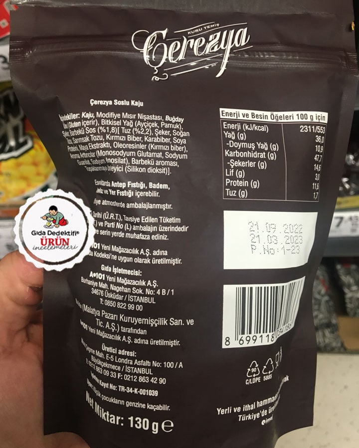 A101 marketlerinde kuruyemiş raflarında satılan ve dikkatimizi çeken bir ürünü inceleyeceğiz: Çerezya Preium Barbekü Soslu Kaju. Ürün 130 gr.’lık paketlerde satılıyor ve ürünün etiket bilgileri üzerinden A101 firması tarafından Malatya Pazarı firmasına fason olarak ürettirildiği anlaşılıyor. Ürün ambalajında “barbekü soslu” ifadesi dikkat çekiyor. Ürünün sıradan kaju fıstığından farklı olarak katkı maddeleri içeren bir çeşit olduğu anlaşılıyor.
