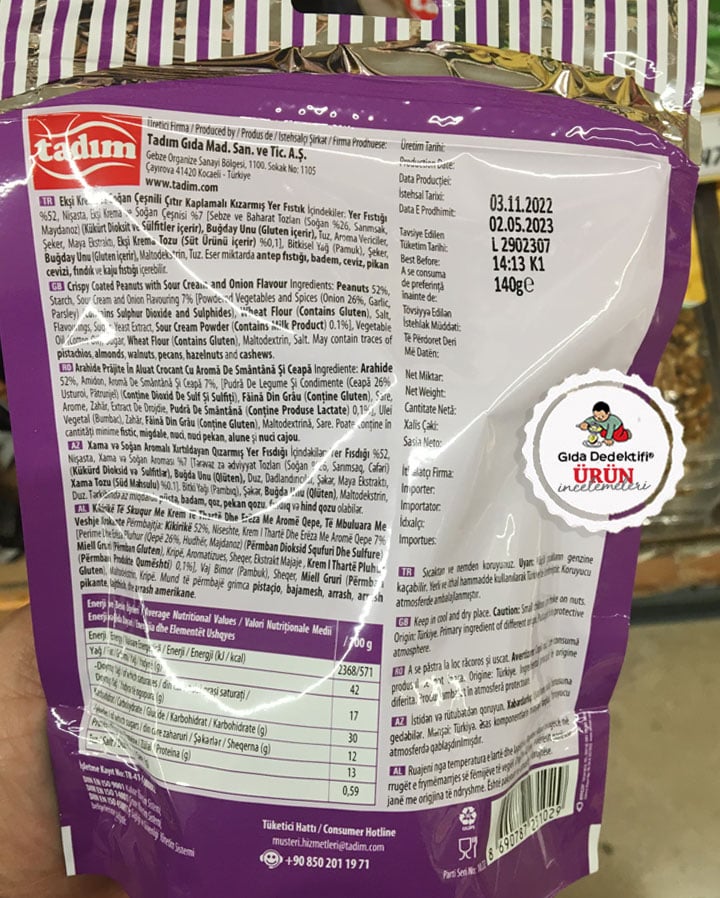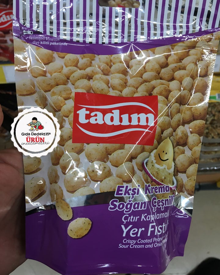 Tadım markasıyla son dönemde raflarda görmeye başladığımız, katkı maddeleri, aroma verici ve ilave şeker içeren yer fıstığı çeşitlerinden birini inceleyeceğiz; Tadım Ekşi Krema Soğan Çeşnili Çıtır Kaplamalı Yer Fıstığı. Ürün 140 gr’lık paketlerde satışa sunuluyor.