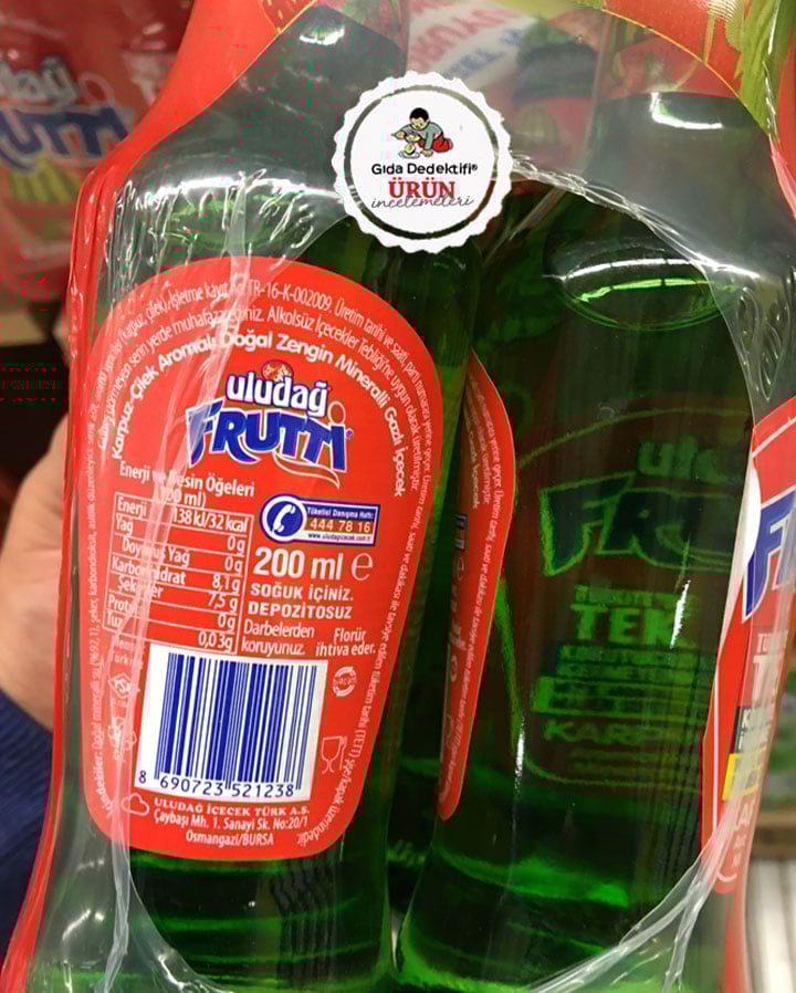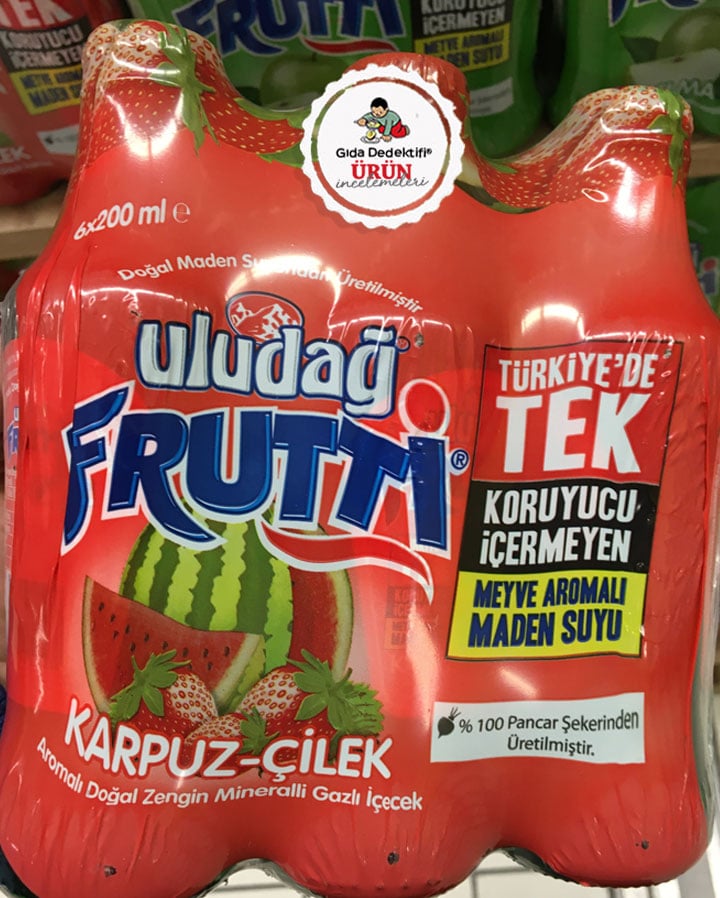Reklamlarında ve ambalajlarında “Türkiye’nin koruyucu içermeyen tek meyve aromalı maden suyu” ifadesiyle tüketicilere sunulan ve ambalajının ön yüzünde ayrıca “%100 pancar şekeriyle üretilmiştir” ifadesi yer alan Uludağ Frutti Karpuz ve Çilek Aromalı Doğal Mineralli Gazlı İçecek ürününü inceliyoruz. Ürün 200 ml’lik şişelerde 6’lı paketlerde satılmaktadır. Paketin yapısı gereği ürünün içerik bilgisi ve besin değerleri kolaylıkla okunamamakta, şişelerin konumu itibariyle bazı paketlerde hiç görülmemektedir. Uludağ firması yaptığı 6’lı ambalaj üzerine de içerik beyanını ısrarla yapmamakta ve tüketiciyi zor durumda bırakmaktadır.