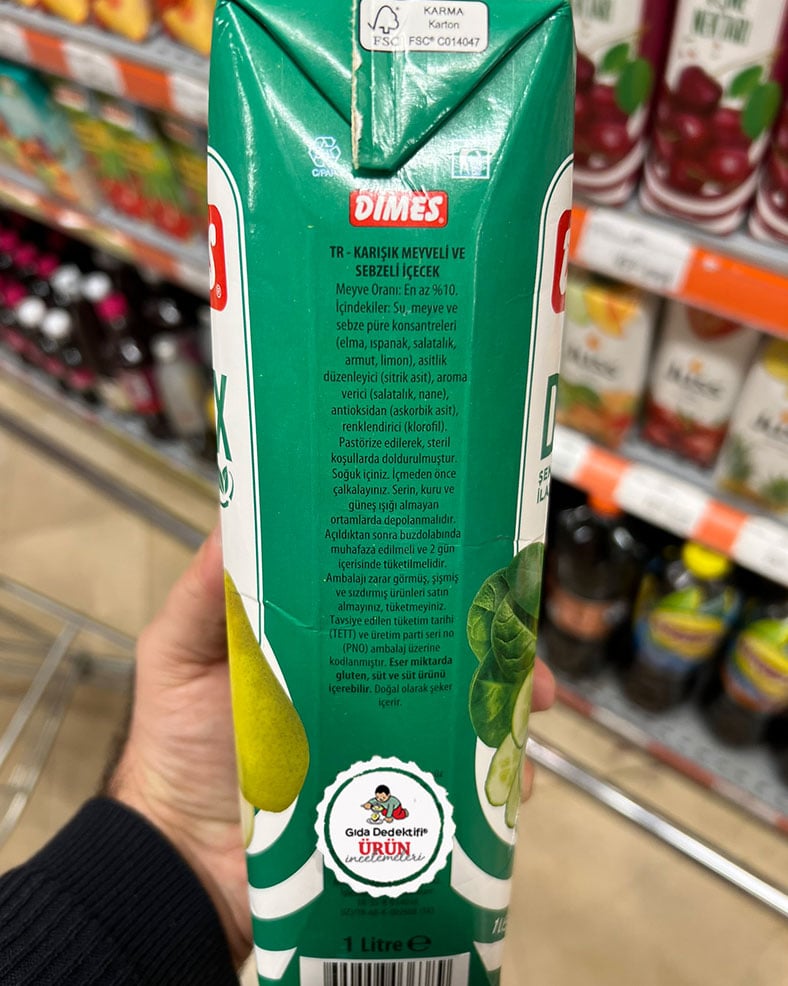 Marketlerin meyve suyu reyonlarında ismiyle dikkat çeken bir ürünü inceleyeceğiz: Dimes 7/24 Detoks. 1 litrelik paketlerde satışa sunulan ürün ambalajında salatalık, ıspanak, armut ve elma görselleri yer alıyor. Ürün “detoks” gibi iddialı bir isimle satılsa da, yasal ismiyle aslında karışık meyveli ve sebzeli içecek olarak tanımlanıyor. Ürün ambalajında ayrıca “şeker ilavesiz” ifadesi yer alıyor.