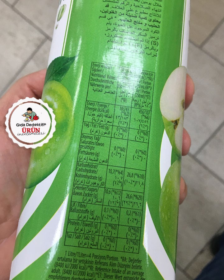 🔎İçindekiler: Su, Şeker (Sakkaroz veya Glikoz-fruktoz şurubu), Elma suyu konsantresi, Asitlik Düzenleyici (Malik asit), Aroma verici (Elma)