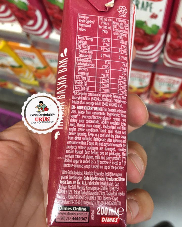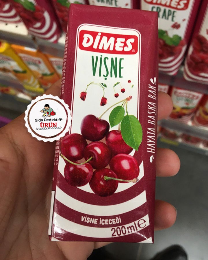 Market raflarında yer alan meyve suyu görünümlü meyveli içecekleri incelemeye devam ediyoruz. Dimes markasıyla 200 ml.’lik paketlerde satılan Vişneli İçecek ürününü inceleyeceğiz. Ürün içeriğinde %20 oranında meyve içeren konsantre kullanıldığını anlıyoruz. Üründe ilave olarak sofra şekeri ya da glikoz-fruktoz şurubu yer alıyor. Bu da tüketiciye -S veya -F kodlamasıyla ambalajın üzerinde veriliyor. Bu kodlamaya göre üründeki ilave şeker çeşidi anlaşılabiliyor.