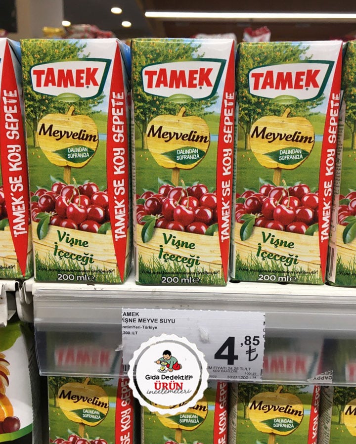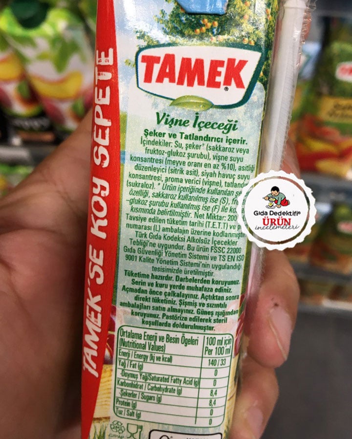 Gün geçtikçe market raflarında sayısı azalan meyve suyu ve meyve nektarlarının yerine şimdi inceleyeceğimiz üründe olduğu gibi meyveli içecekler görmeye başladık. Benzer şekilde içeriğinde %10 oranında meyve içeren konsantre bulunan ve “meyveli içecek” kategorisinde yer alan bir ürünü inceleyeceğiz: Tamek Meyvelim Vişne İçeceği. Ürün 1 litrelik boylarının yanı sıra 200 ml’lik ambalajlarda satılıyor. Ürün ambalajında “Tamek’se koy sepete” ve “Dalından sofralara” ifadeleriyle vişne görselleri bulunuyor.