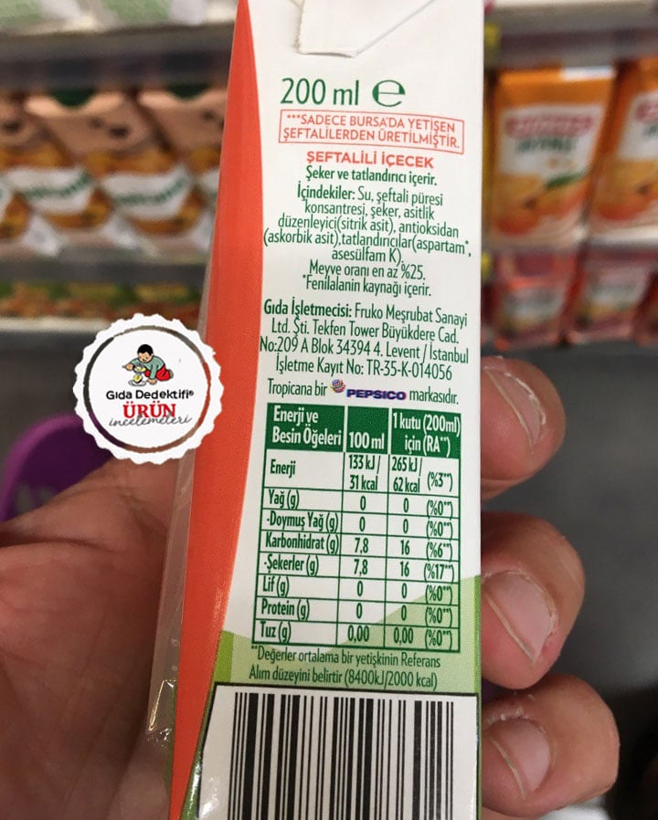Okulların açıldığı bu hafta itibariyle öğrencilerin beslenmelerine konan ve genellikle “meyve suyu” diye bilinen meyveli içecekleri incelemeye başlıyoruz. Bunlardan ilki ambalajının ön yüzünde “Bursa’dan Şeftali” ifadesiyle dikkat çeken Tropicana Şeftalili İçecek. Ürün meyve suyu ya da meyve nektarı kategorisinde olmayıp içerdiği %25 oranında meyve bulunan konsantresiyle meyveli içecek sınıfındadır. Ürünün kantin genelgesi uyarınca okul kantinlerinde satılmaya uygun nitelikte olmadığını da özellikle belirtelim. Ürün 200 ml.’lik paketlerde satılmakta olup, Pepsico firmasına ait Fruko Meşrubat Sanayi İzmir fabrikasında üretilmektedir.