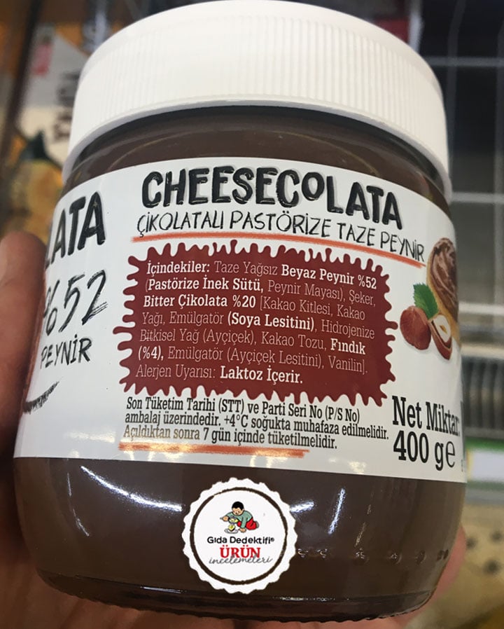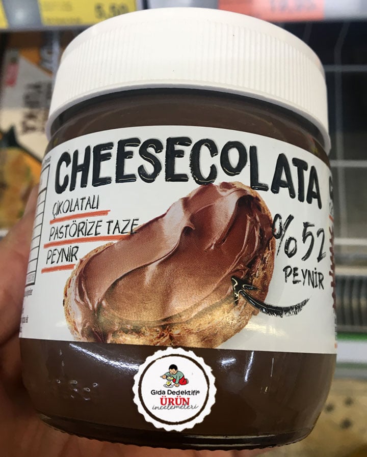 Bir süredir sürülebilir taze peynirler raflarda farklı çeşitlerde yer almaya başladı. Bunlar arasında farklı markalara ait çeşnili ve çikolatalı olan çeşitleri daha önce incelemiştik. Bazı takipçilerimiz tarafından gönderilerek incelenmesini istediği yeni bir ürünü inceleyeceğiz; Cheesecolata markasıyla piyasaya sürülen çikolatalı taze peynir. Ürün ambalajın ön yüzünde yer alan %52 peynir ifadesiyle dikkat çekiyor. Ürünün üreticisi konumunda peynir ve kefir ürünleriyle bilinen Altınkılıç firmasının olduğunu da söylemek gerekiyor. Üründe sıradan kakaolu fındık kremalarına oranla daha az oranda ilave şeker yer alırken, bitkisel yağ olarak Palm yağı bulunmuyor.