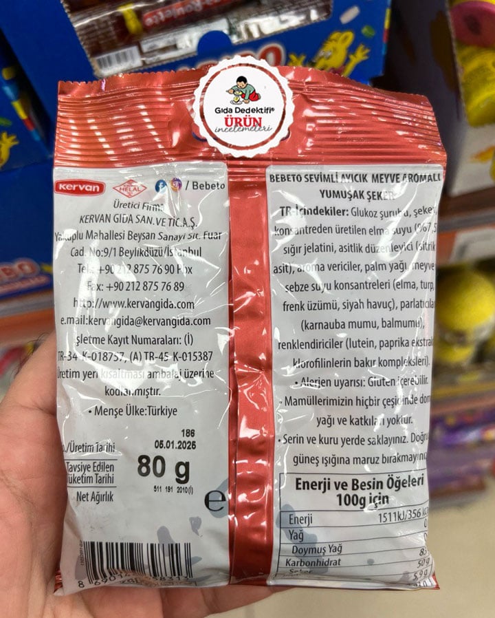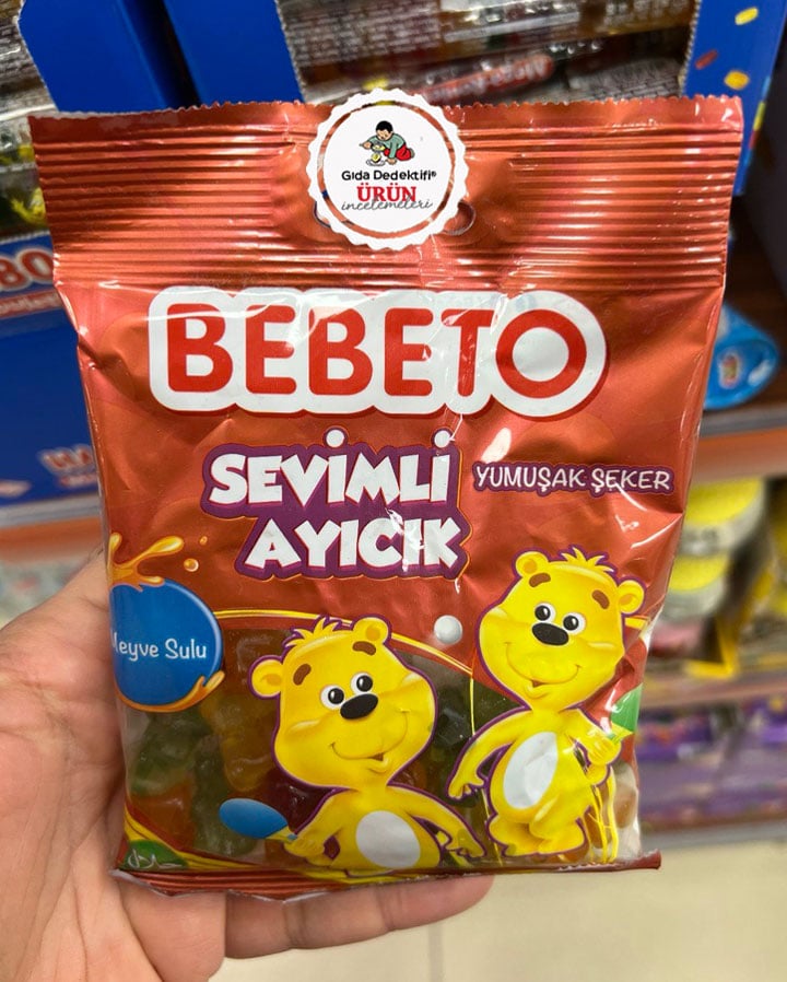 Kervan Gıda tarafından üretilerek yurtdışında da satışa sunulan yumuşak şekerlemelerden birini inceleyeceğiz; Bebeto Sevimli Ayıcıklar. Yumuşak şekerleme formundaki ürün 80 gr’lık paketlerde satışa sunuluyor. Ürün ambalajında “meyve sulu” ifadesi ile Helal logosu dikkat çekiyor.