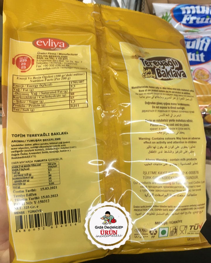 Konya’da üretim yapan Evliya firmasının sahibi başta olmak üzere tüm çalışanlarını aklı selim olmaya, iftira, hakaret ve karalama içeren ifadelerini ivedilikle geri çekmeye ve tüketicilere dürüstçe açıklamaya yapmaya davet ediyoruz. Firma sahibinin tereyağ içeriyor dediği ürünün de tereyağı yerine Palm yağı içerdiğini yayınlarımızdan değil, etiketin arkasından kendisi de teyit edebilir.Ürün içeriğine geldiğimizdeyse; ürünün ilk 3 sırada; Şeker, Glikoz şurubu ve Palm yağı içerdiğini görüyoruz. Ürün bu temel bileşenlerin yanında mısır nişastası, asitliği düzenleyici ve emülgatör olarak da Ayçiçek lesitini içeriyor. Üründe Sığır jelatini yer alırken; ürün etiketinde herhangi bir helal logosu ya da sertifikası bulunmuyor. Ürün bunların yanında doğala özdeş aroma vericiler olarak sırasıyla fıstık, tereyağ ve baklava aromaları içeriyor. Ürün ayrıca tüketiciye sadece E171 koduyla beyan edilse de; Renklendirici olarak Titanyum Dioksit içeriyor.