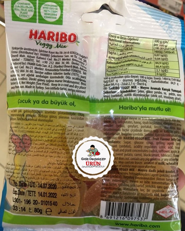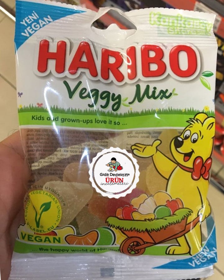 Daha önce bazı çeşitlerini incelediğimiz ve özellikle giyim mağazaları, oyuncakçılar ve kitapçılarda çocuklara yönelik etik bulmadığımız pazarlama faaliyetleriyle gündeme getirdiğimiz Haribo markasının Veggy Mix ürününü inceleyeceğiz. Ürün 80 gr.’lık paketlerde satılıyor ve Türkiye’de üretiliyor. Sığır jelatini içeren çeşitlerinin yanında Haribo Veggy Mix hayvansal bir bileşen içermiyor. Üründe Sığır Jelatini yerine Pektin bulunmaktadır. Özellikle reçel içeriklerinde karşımıza çıkan petkin, bitkisel bir hammaddeden üretilmektedir.