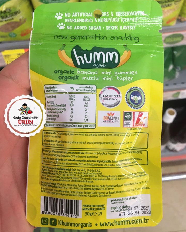 Son yıllarda belki bir elin parmaklarını geçmese de çocuklar için ilave şeker, tatlandırıcı ve yapay katkı maddesi içermeyen ürünler üreten bazı markaları incelemelerimize taşımaya çalışıyoruz. Bunlardan biri olan Humm Organic markasıyla piyasaya çıkan yeni bir ürünü inceleyeceğiz; Organik Muzlu Mini Küpler. 30 gr.’lık paketlerde satılan ve bir çeşit “yumuşak şeker” olan ürün içeriğinde sığır jelatini veya aroma verici dahil olmak üzere herhangi bir katkı maddesi veya yapay bileşen yer almıyor. Ürünün Organik Tarım sertifikası yanı sıra; Helal sertifikası ve Vegan beyanı bulunuyor. Ürün GGK Yiyecek ve İçecek A.Ş. firması tarafından geliştirilerek BTA Unlu Mamuller tarafından fason olarak üretiliyor.