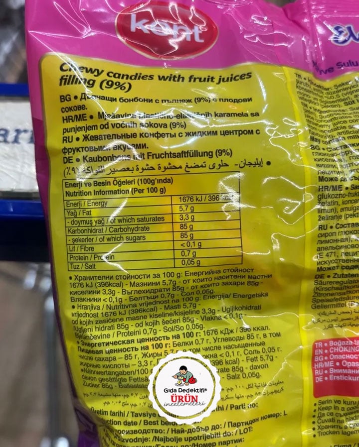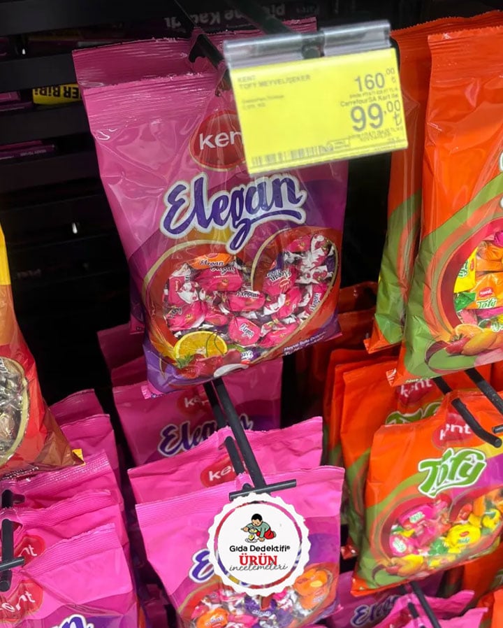 Özellikle bayram şekeri olarak da sıklıkla tercih edilen ve market reyonlarında büyük poşetlerle satışa sunulan bir ürünü inceleyeceğiz: Kent Elegan Meyve Sulu Dolgulu Şekerleme. Yasal ismiyle meyve suyu dolgulu çiğnenebilir şekerlemeler olarak tanımlanan ürün renkli ambalajlarında meyve görselleri ve meyve suyu dolgulu şeker fotoğraflarıyla tüketiciye sunuluyor. Ürünün Mondelez International'a ait Kocaeli'deki Kent Gıda tesislerinde üretildiği anlaşılıyor. Ambalajda ayrıca 4 yaşın altındaki çocuklar için boğaza takılma tehlikesi uyarısı da yer alıyor.