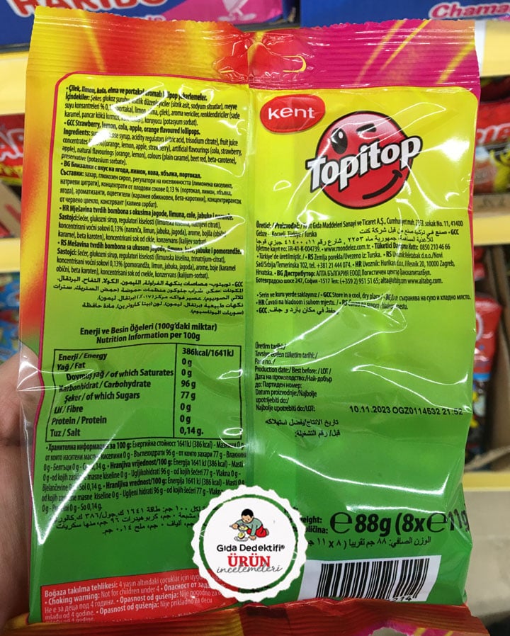 Uzun yıllardır market raflarında özellikle çocuklara yönelik yaygın olarak satışı yapılan lolipop olarak bilinen şekerlemelerden en bilinen markayı inceliyoruz; Kent Topitop. Daha önce yerli üretim modeliyle üretim yapan fakat son yıllarda yapılan satın almalar sonrasında Mondelez International tarafından üretilmeye başlanan Kent markalı ürünlerden Topitop, tekli satışının yanı sıra 8 adetlik paketlerde de satılıyor. Ürünün tek adedi 11 gr.’lık şekerleme içeriyor.