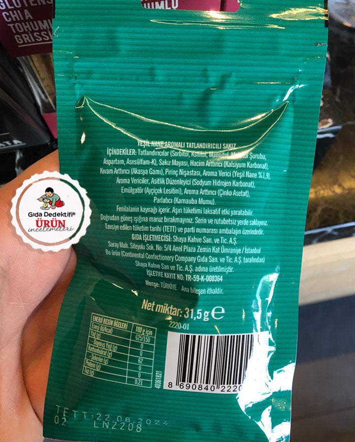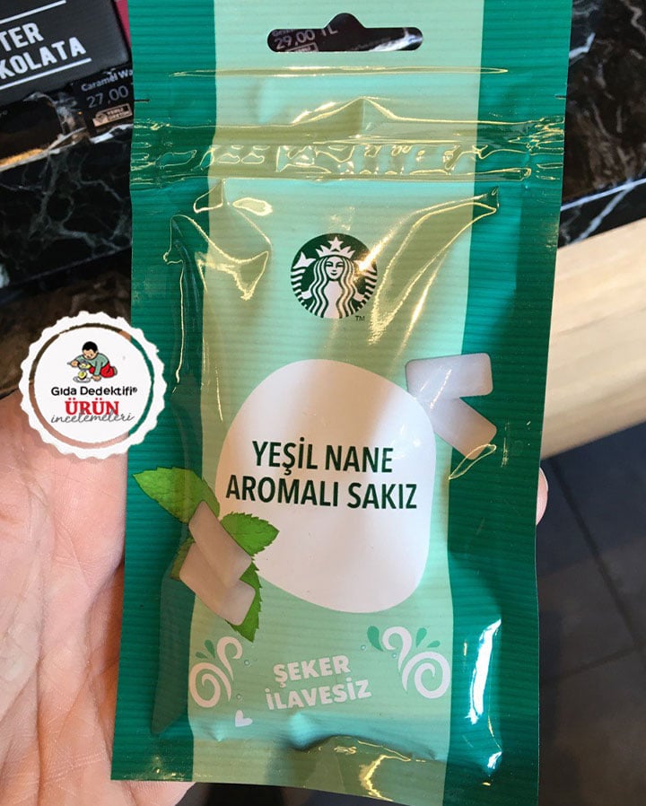 Starbucks kasa önlerinde son dönemlerde dikkat çeken ürünlerden birini inceleyeceğiz; Starbucks Yeşil Nane Aromalı Sakız. Ürün 31,5 gr.’lık paketlerde “Şeker ilavesiz” vurgusu ve nane görselleriyle satılıyor. Ambalajının arkasına baktığımızdaysa üründe çok sayıda tatlandırıcı bulunduğunu görüyoruz. Ürünün ayrıca Starbucks adına Ülker’in ortak olduğu ve Ülker Oneo sakızlarını da üreten CCC Gıda tarafından üretildiğini yine etiket verilerinden anlıyoruz. Buna göre ürün Ülker Oneo, Kremini gibi ürünlerin üretildiği Tekirdağ’daki tesislerde fason olarak üretiliyor.