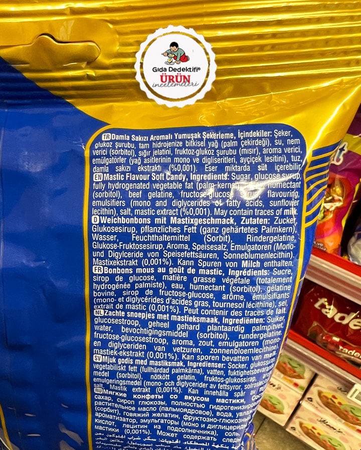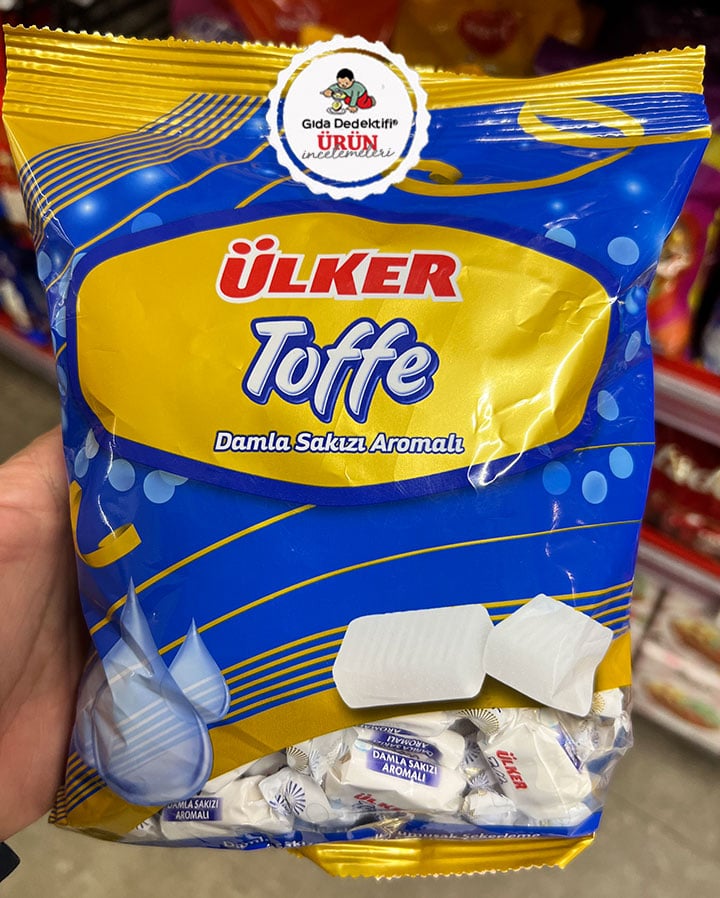 Ülker markasıyla ikramlık şekerleme olarak satışa sunulan Toffe Damla Sakızı Aromalı Yumuşak Şekerleme ürününü inceliyoruz. Ürün kiloluk olarak marketlerde açık şekilde satılmakta olup, ayrıca 350 gr’lık paketlerde satılıyor. Ürün ambalajında “damla sakızı” görselleri yer alırken, üründe %0,001 yani yüzbinde 1 oranında damla sakızı ekstraktı yer alıyor. Üründe zerre denebilecek orandaki damla sakızının yanında ayrıca yapay damla sakızı aroma vericisi de bulunuyor.