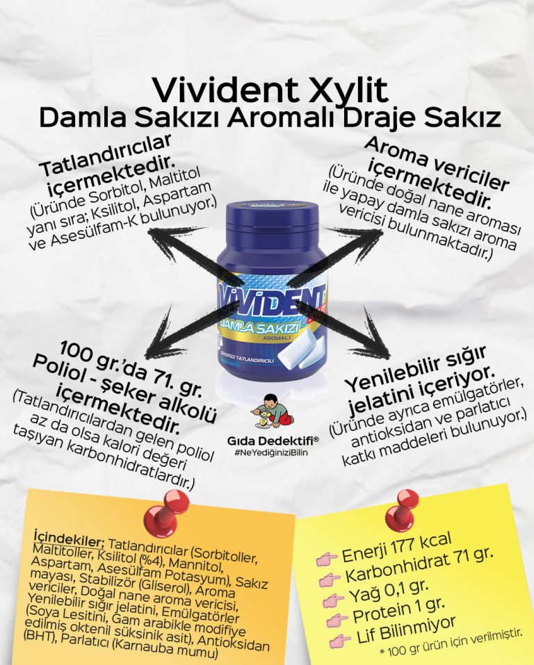 🔍İçindekiler: Tatlandırıcılar (Sorbitoller, Ksilitol (%28), Aspartam, Asesülfam Potasyum, Sukraloz), Sakız mayası, Aroma vericiler (%3), Asitler (Tartarik asit, Malik asit, Sitrik asit), Stabilizör (Gliserol), Emülgatör (Soya lesitini), Antioksidan (Bütillenmiş Hidroksitolüen), Renklendiriciler (Karmin, Karotenler)
