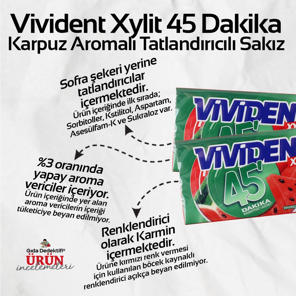 Perfetti firması tarafından İstanbul Esenyurt’ta üretilerek satışa sunulan tatlandırıcılı şekersiz sakızlardan Vivident Xylit markalı 45 Dakika Karpuz Aromalı ürünü inceleyeceğiz. Ürünün 45 Dakika ismini 2023 yılının Ekim ayında 80 kişiyle yapılan bir araştırma çerçevesinde aldığı anlaşılıyor. Buna göre IPSOS tarafından yapılan araştırma kapsamında 80 kişinin ürünün çiğnedikten 45 dakika sonra kesintisiz lezzet sağladığına dair bilimselliği tartışılacak düzeyde olan verilere istinaden ürün ambalajında “45 dakika kesintisiz lezzet” ibaresi yer alıyor. Lezzet olarak belirtilen şeyin aslında yapay aroma vericilerden gelen kimyasal tat olduğunu ve ürün içeriğinde %3 oranında yapay aroma vericiler bulunduğunu en baştan vurgulamak gerekiyor.