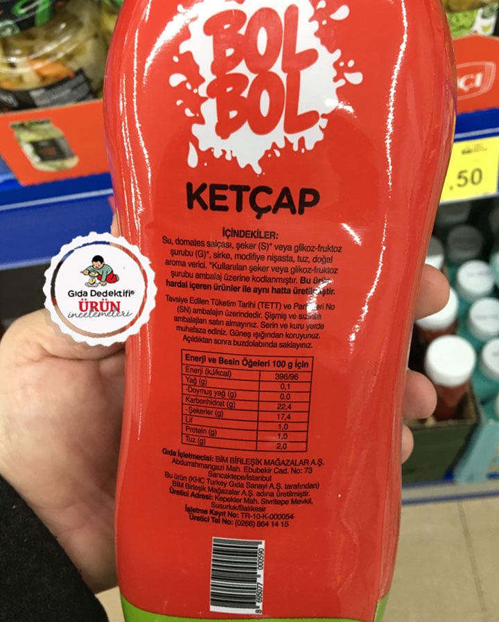 Ambalajında 2021 yılında bir enstitü tarafından ücret karşılığında verilen bir lezzet ödülü logosuyla dikkat çeken ve uzun yıllardır Bim mağazalarında farklı fason üreticiler tarafından ürettirilen Bol Bol Ketçap ürününü inceleyeceğiz. Fason üretim yaptırdığını tüketiciden bilerek gizleyen ve sadece işletme kodu yazarak “mevzuatın gereğini yerine getiren” firmaların yanı sıra, marketlerin private label olarak ürettikleri firma bilgisini tüketiciye mevzuat gereği açıkça beyan ettiğini söyleyelim. Bu haliyle İstanbul’daki bir mağazada tespit ettiğimiz ürünün üreticisinin ise KHC Turkey Gıda Sanayi olduğu etikette açıkça görüyoruz. Ürün 1 kg’lık paketlerde satışa sunulurken ambalajın ön yüzünde “Koruyucu içermez” ibaresi yer alıyor.