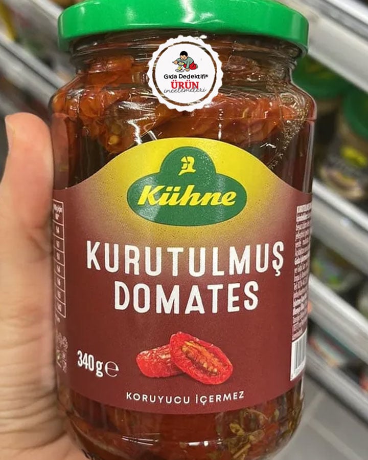 Marketlerin konserve ve hazır gıda reyonlarında dikkatimizi çeken bir ürünü inceleyeceğiz: Kühne Kurutulmuş Domates. 340 gr'lık cam kavanozlarda satışa sunulan ürün ambalajında "Koruyucu İçermez" ifadesiyle tüketiciye sunulurken, ürünün pastörize edildiği de ayrıca belirtiliyor. Burada dikkat çeken bir detay var: ürünün net ağırlığı 340 gr olarak belirtilirken, süzme ağırlığı 200 gr olarak beyan ediliyor. Yani kavanozun yaklaşık %41'i sıvı içerikten oluşuyor. Ürünün gıda işletmecisi olarak İstanbul Beykoz'daki Carl Kühne Fermantasyon ve Gıda San. ve Tic. A.Ş. firması gözükürken, üretimin Türkiye'de gerçekleştirildiği anlaşılıyor.