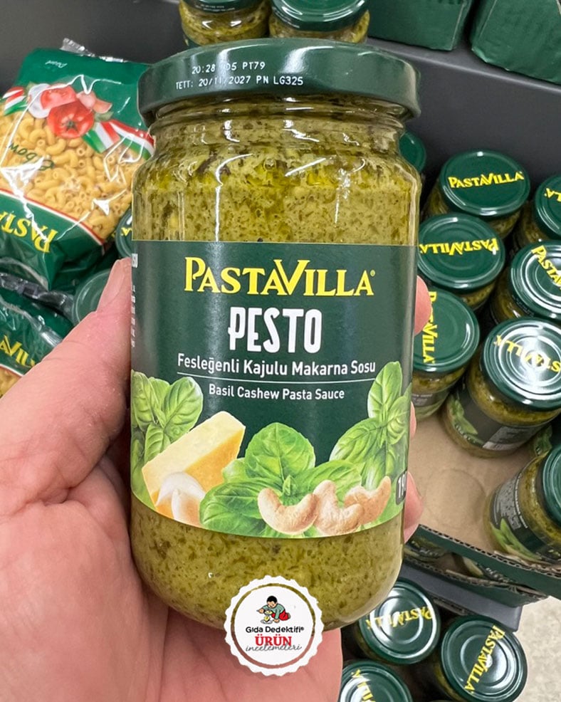 İtalyan markası gibi gözükse de aslında yerli bir firma olan ve makarna ürünleriyle bilinen Pastavilla tarafından 190 gr’lık cam kavanozlarda satışa sunulan Pesto Makarna sosu ürününü inceleyeceğiz. Ambalajının ön yüzünde fesleğen, kaju ve peynir görselleri yer alan ve fesleğenli kajulu makarna sosu olarak tanımlanan ürünün Durum Gıda San. Tic. A.Ş. firması tarafından İtalya’dan ithal edildiği anlaşılıyor.