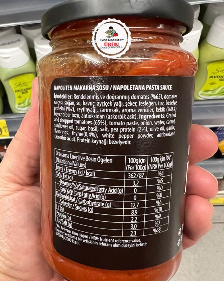 🔍İçindekiler: Rendelenmiş ve doğranmış domates (%65), domates salçası, soğan, su, havuç, ayçiçek yağı, şeker, fesleğen, tuz, bezelye proteini (%2), zeytinyağı, sarımsak, aroma vericiler, kekik (%0,4), beyaz biber tozu, antioksidan (askorbik asit)