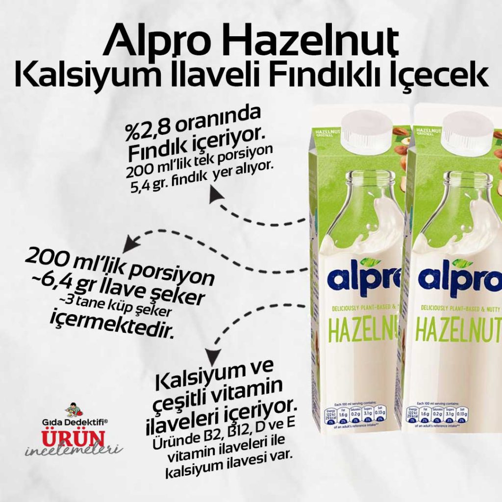 Fransa’da üretilerek ülkemize ithal edilen ve üzerinde fındık görselleriyle dikkat çeken Alpro Hazelnut Fındıklı İçecek ürününü inceliyoruz. Ürün tamamen bitkisel kaynaklı ve vegan sertifikalı bir ürün olup, içeriğinde hayvansal bazlı süt veya süt ürünü içermemektedir. Ürün süt ürünlerine oranla çok daha yüksek fiyatlarla 1 litrelik ambalajlarda satışa sunuluyor.