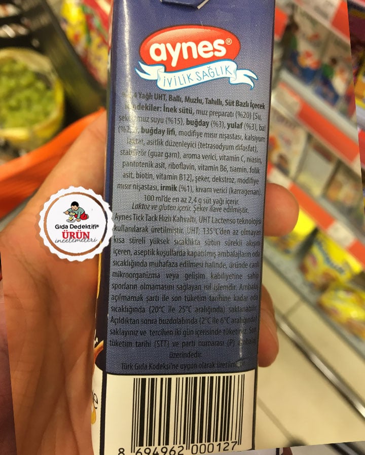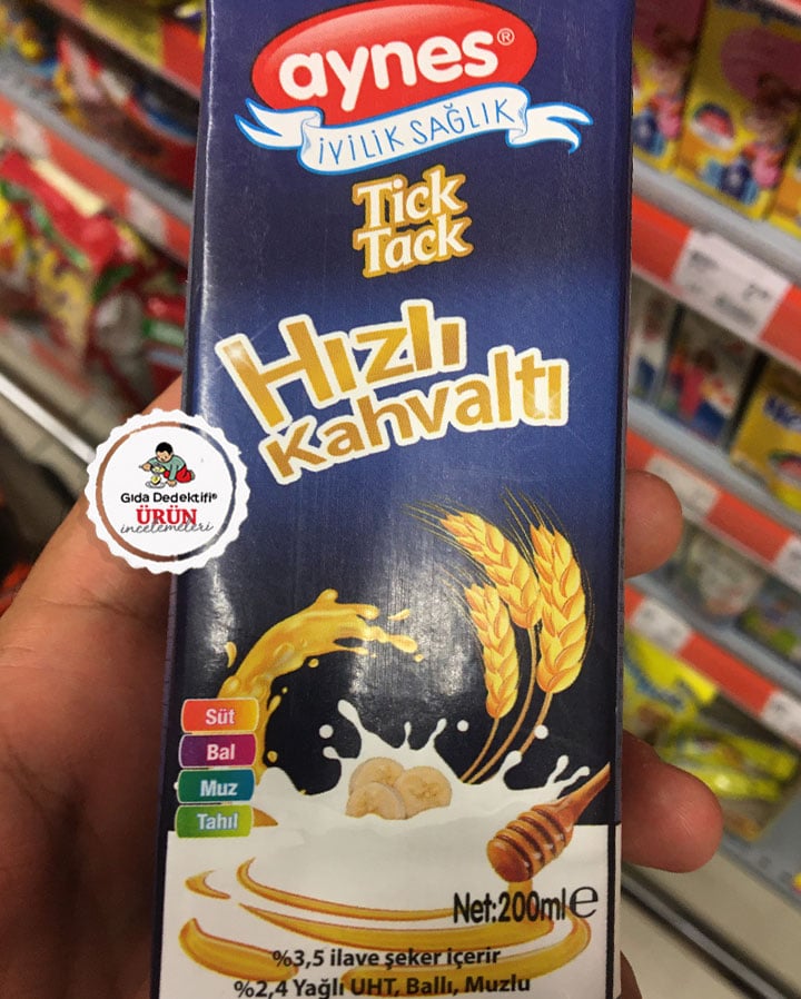 Bir süredir raflarda dikkatimizi çeken ve Hızlı Kahvaltı gibi iddialı bir isimle satılan Aynes markalı Ballı, Muzlu, Tahıllı Süt bazlı içeceği inceleyeceğiz. Ürün 200 ml.’lik tüketime hazır pipetli kutularda satılıyor. Ürün üzerinde Süt, Bal, Muz ve Tahıl ifadeleri ve görselleri yer alıyor. Ürün içeriğine baktığımızda ilk 3 sırada İnek sütü, Muz preparatı ve Şeker yer alıyor. Üründe inek sütü oranı bilinmiyor. İkinci sırada yer alan Muz preparatının oranı ise %20 olarak görülüyor. Muz preparatında ilk 3 sırada ise Su, şeker ve muz suyu yer alıyor. %20 oranında muz preparatı içeriğinde %15 muz suyu yer alıyor – ki bu da %3 oranında muz suyu olduğunu gösteriyor. Muz preparatı içeriğinde ayrıca %3 oranında buğday, %3 oranında yulaf, %2,5 oranında bal yanı sıra buğday lifi ve modifiye mısır nişastası bulunuyor.