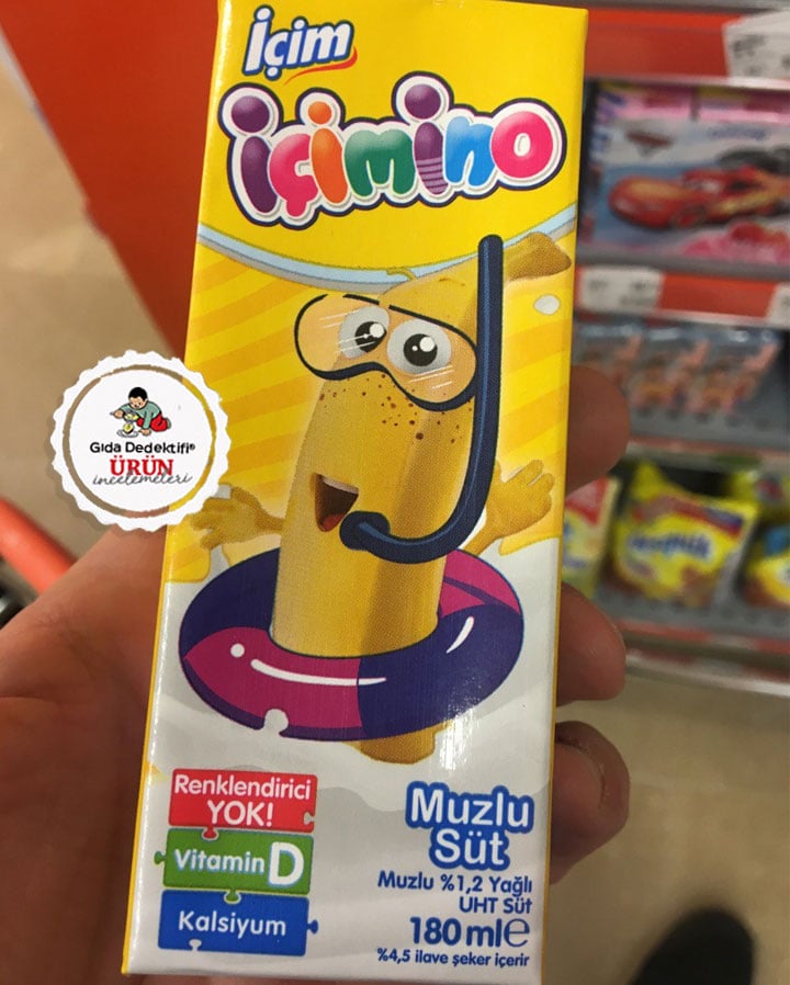 Üzerinde çocuklara yönelik çekici çizgi film karakterleri yer alan meyveli ve aromalı sütlerden birini inceleyeceğiz; İçim İçimino Muzlu Süt. Ürün 180 ml’lik pipetli kutularda satılıyor. Ambalaj üzerinde “Renklendirici yok”, “D vitamini,” “Kalsiyum” gibi vurguların yanı sıra; “%4,5 ilave şeker içerir” yasal uyarısı yer alıyor. Ürün ambalajının yan kısmında ise “1 paket günlük kalsiyum ihtiyacının %20’sini karşılıyor” ifadesi bulunuyor.