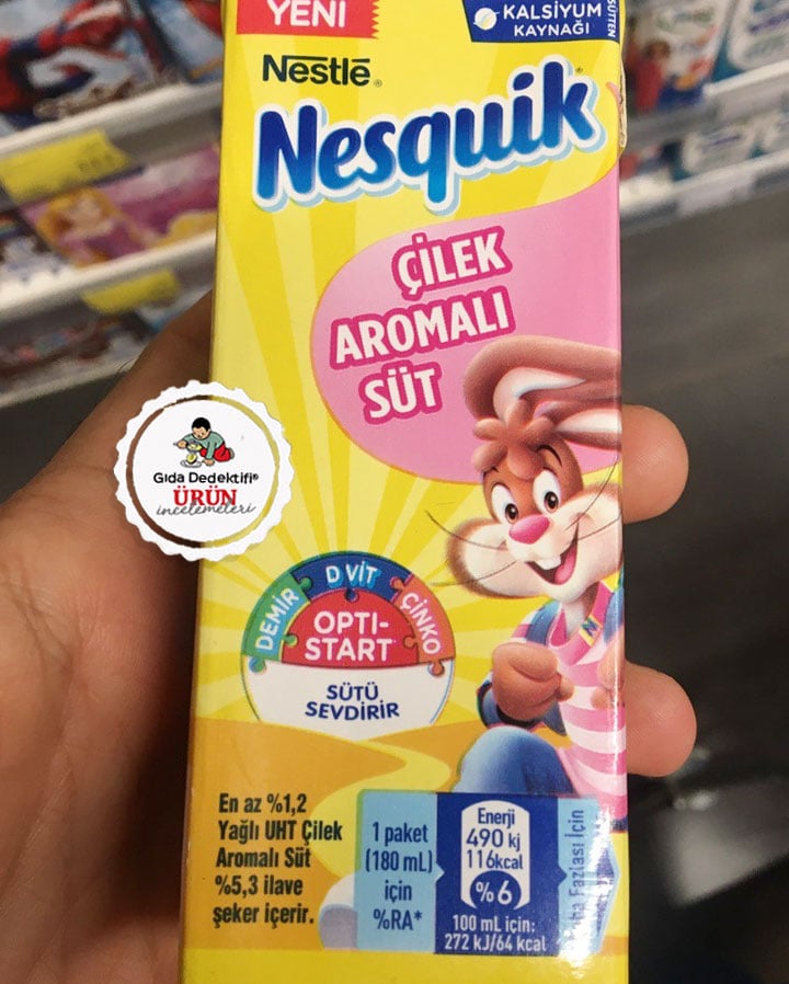 Daha önce farklı çeşitlerini incelediğimiz hatta laktozsuz süt formunda “Şeker ilavesiz” Kakaolu süt ürününe de yer verdiğimiz Nestlé Nesquik markasının Çilek Aromalı Süt ürününü inceleyeceğiz. Ürün 180 ml.’lik kutularda satılıyor. Ürün üzerinde “Sütü sevdirir” ve “Opti Start”, “Demir, D vitamini, Çinko” gibi ifadeler yer alıyor. Ürün etiketinin ön yüzünde ayrıca yönetmelik gereği kalori oranı ve üründeki ilave şeker oranı da açıkça beyan ediliyor.