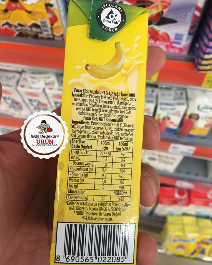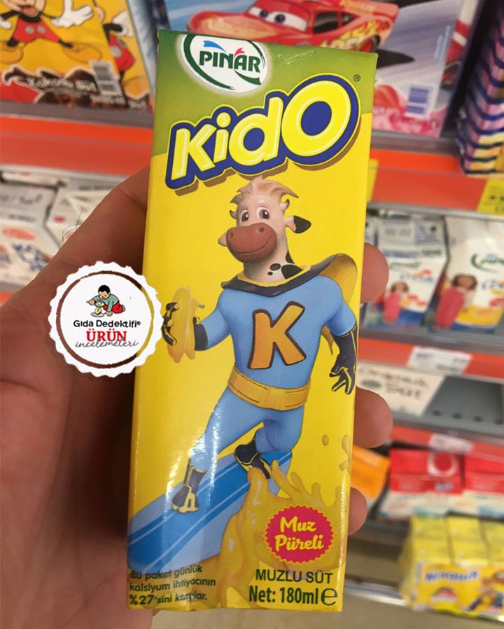 Üzerinde sörf yapan bir ineğin tutuğu muzlar bulunan ambalajda “Muz püreli” ve “Kalsiyum ihtiyacının %27’sini karşılar” ifadeleriyle satılan Pınar Kido Muzlu Süt ürününü inceleyeceğiz. Ürün 180 ml’lik pipetli içime hazır kutularda satılıyor. Ürün tam ismiyle %1,2 yağlı – yani tam yağlı sütün yarısından daha az süt yağı içeren UHT süte sofra şeker ilavesiyle tatlandırılmış bir ürün olarak tanımlanabilir.