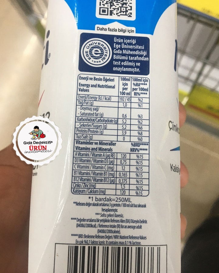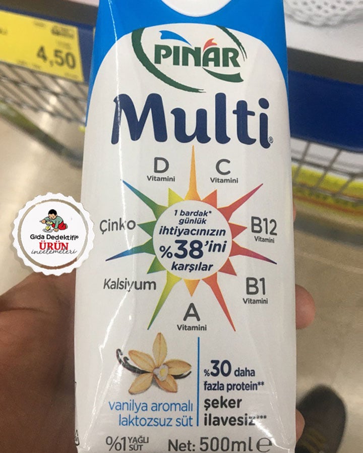 Uzun süredir raflarda yer alan protein sütleriyle bilienen Pınar tarafından üretilen Multi isimli vitaminli laktozsuz sütleri inceleyeceğiz. 500 ml.’lik ambalajlarda satılan ürün önceki gün Bim marketlerde dikkatimizi çekti. Ürün içeriğinde %1,1 yağlı inek sütü yanı sıra; ilave vitaminler, mineraller ve çeşitli katkılar içermektedir.