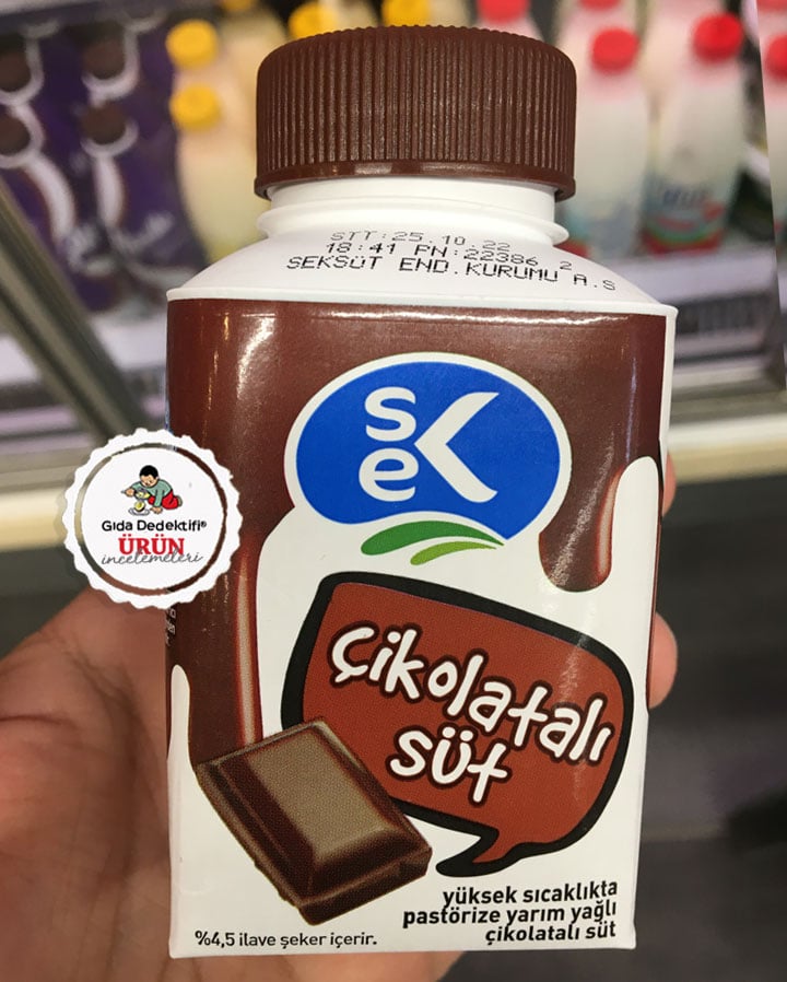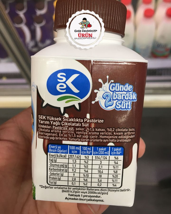 Ambalajında çikolata görseliyle market raflarında dikkatimizi çeken SEK Çikolata Süt ürününü inceliyoruz. Ürün 200 ml’lik paketlerde satılmakta olup, ambalajında “Yüksek sıcaklıkta pastörize edilmiş yarım yağlı çikolatalı süt” ibaresi yer alıyor. Ürünün ayrıca ön yüzünde “%4,5 ilave şeker içerir” beyanı da önem arz ediyor. Öyle ki, bu ibare sayesinde sütten gelen laktoz haricinde ürüne ne kadar oranda ilave şeker konulduğunu da anlayabiliyoruz.