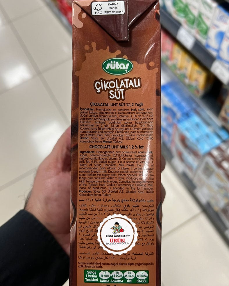 Sütaş markasıyla satışa sunulan ve market raflarında “ister soğuk, ister sıcak” vurgusuyla dikkat çeken Çikolatalı Süt ürününü inceleyeceğiz. Ürün 1 litrelik paketlerde satışa sunuluyor ve içeriğinde %1,2 yağlı süt bulunduğu anlaşılıyor. Üründe kullanılan ilave şeker oranı da mevzuat gereği paketin ön yüzünde tüketiciye beyan ediliyor. Ürün ambalajında ayrıca “çikolata” görselleri de dikkat çekiyor fakat ürünün içerdiği çikolata oranı görsellerle pek uyumlu değil.