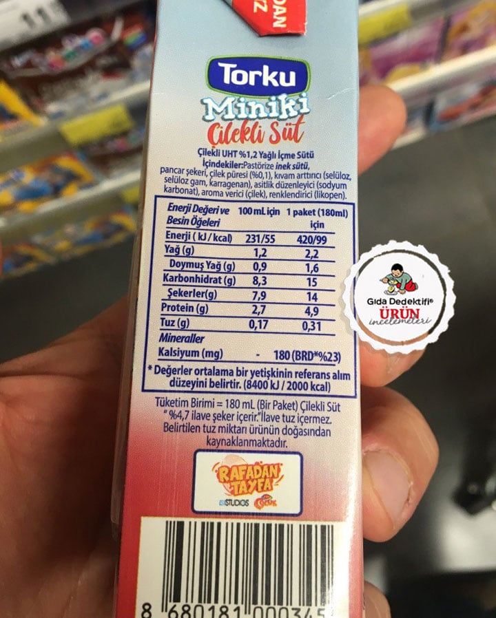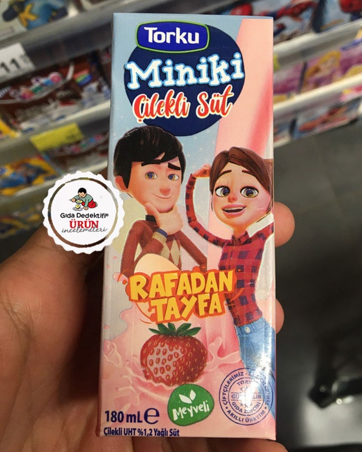 Torku markasıyla çocuklara yönelik üretilen Çilekli Süt ürününü inceleyeceğiz. Ürün 180 ml.’lik tüketime hazır pipetli kutularda satılıyor. Ürün “Miniki” ismi ve üzerinde yer alan çizgi film karakteriyle doğrudan çocuklara yönelik üretilerek pazarlanıyor. Ürün üzerinde “Meyveli” vurgusu dikkat çekiyor. Üründe %0,1 yani binde 1 oranında Çilek püresi yer alıyor. Üründe bunun dışında bir meyve içeriği bulunmuyor.
