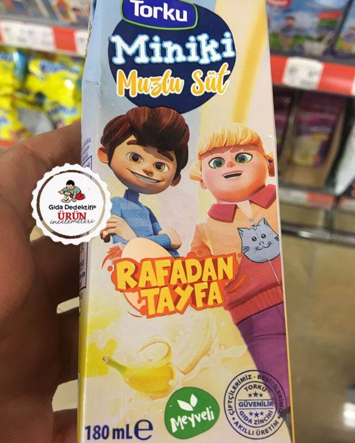 Ürün üzerinde TRT Çocuk’ta yayınlanan ve çocuklar tarafından sevilerek izlenen Rafadan Tayfa görselleri yer alıyor. Çocuklara yönelik bir ürün olarak pazarlanan bu “muzlu” süt ürününde temel olarak %1,2 oranında yağ içeren pastörize süt ve pancar şekeri yer alıyor. Ürün etiketinde ilave şeker oranı açıkça beyan ediliyor ve buna göre biz de 180 ml’lik tek kutuda 7,9 gr. ilave şeker olduğunu anlıyoruz. Bu haliyle tek kutu tüketen bir çocuğun 4 tane küp şeker atılmış bir süt tükettiğini vurgulamak gerekiyor. Tabii bu tüketim liflerinden yoksun ve muzdan gelen hiçbir vitamin ya da mineral değeri olmadan yapılıyor.