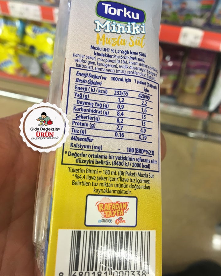 Türkiye’nin en büyük şeker kooperatiflerinden ve “Doğal olarak bizden” sloganıyla her ürününde Anadolu topraklarında üretilen çiftçi ürünlerinin bulunduğu ve doğallık vurgusu yapan Torku markalı Muzlu Süt ürününü inceleyeceğiz. İlk olarak üründe %4,4 oranında ilave sofra şekerinin yanında %0,1 yani binde 1 oranında muz püresi bulunduğunu söyleyelim. Bu haliyle ürürün 180 ml’lik kutusunda 0,18 gr. yani bir gramın 5’te biri oranında muz püresi bulunmaktadır.