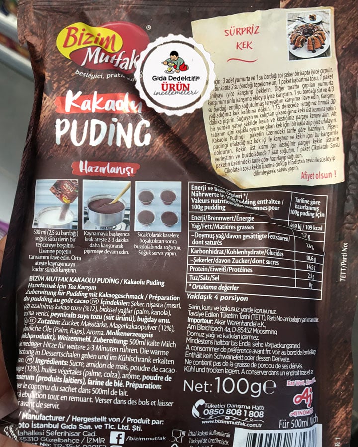 Ürün içeriğine baktığımızda ilk 3 sırada; Şeker, mısır nişastası ve yağı azaltılmış kakao tozu olduğunu görüyoruz. Bu da aslında bizim puding olarak bildiğimiz tatlının temel bileşenlerini gösteriyor. Puding denen şey temelde şeker, nişasta ve kakaodan oluşuyor. Üründe kakao tozu oranı %12 olarak dikkat çekerken, ilave şeker ilk sırada yer almasına rağmen oranı bilinmiyor. Buna göre ürünün tek paketiyle yapılan puding toplamda 87 gr. şeker içerirken, 500 ml. sütte yaklaşık 22,5 gr. laktoz olduğu bilgisi çerçevesinde bunun yaklaşık 64,5 gramının ilave şeker ve kısmen nişastadan gelen glikoz olduğu anlaşılıyor. Fakat üründeki ilave şeker oranı net olarak belirtilmediği için hesaplanamıyor.