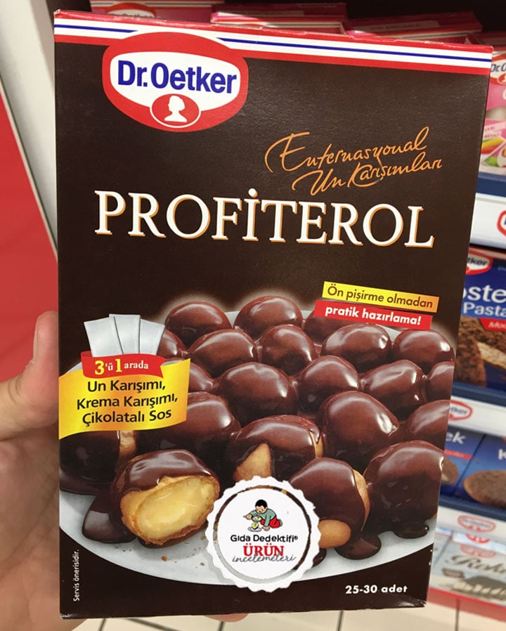 Market raflarında tarifine göre evde hazırlanan tatlı ve unlu mamullerin çeşitleri gün geçtikçe artmaya devam ediyor; Dr Oetker markalı Profiterol ürününü inceleyeceğiz. Ürün 380 gr.’lık paketlerde satılıyor ve ürün içeriğinde 25-30 adet profiterol bulunduğu etiket üzerinden beyan ediliyor. Ürün içeriğinde profiterol toz karışımı ve hazırlanmak üzere çikolatalı sos bulunuyor.