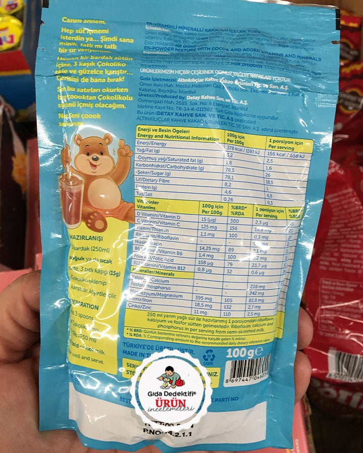Ürün toz haliyle mineral ve vitamin ilaveleri içeriyor. Buna göre üründe magnezyum sülfat, demir laktat ve çinko sülfat ilaveleri ile C vitamini, Tiamin, Niasin, B6 vitamini, Folik asit, B12 vitamini ve D vitamini ilavesi yer alıyor. Ürün buna göre 15 gr’lık tek porsiyon tozda günlük ihtiyacın %5’i ila %45’i arasında değişen oranlarda vitamin ve mineraller içeriyor. Üründe tek porsiyonda tozdan gelen 18,8 mg C vitamini, 2,7 mg demir ve sütten gelen kalsiyumla birlikte 238 mg Kalsiyum bulunduğunu söyleyelim. Üründe emülgatör olarak soya lesitini yer alırken, içeriği beyan edilmeyen yapay aroma vericiler bulunuyor. Ürünün son sırasında yer alan bu aroma vericilerin ürüne ne aroması verdiği ise bilinmiyor. #NeYediğiniziBilin