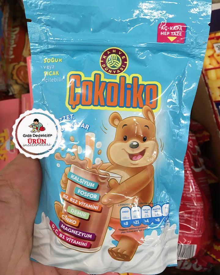 Kahve Dünyası mağazalarında ve çeşitli marketlerde satışa sunulan ve çocuklara yönelik olarak üretildiği anlaşılan Çokokilo Vitamin ve Mineral İlaveli Kakaolu İçecek tozu ürününü inceleyeceğiz. Ürün 100 gr’lık ambalajlarda satışa sunuluyor ve 250 ml’lik tek bardak sıcak ya da soğuk süte 15 gr ürünün ilave edilmesiyle hazırlanıyor. Ürünün ön yüzünde sevimli bir ayıcık ile çocuklar için çekici hale getirildiği, içeriğindeki şekerden hiç bahsedilmeksizin vitamin ve minerallerin sıralanarak “faydalı bir ürün” algısı oluşturulduğu görülüyor.