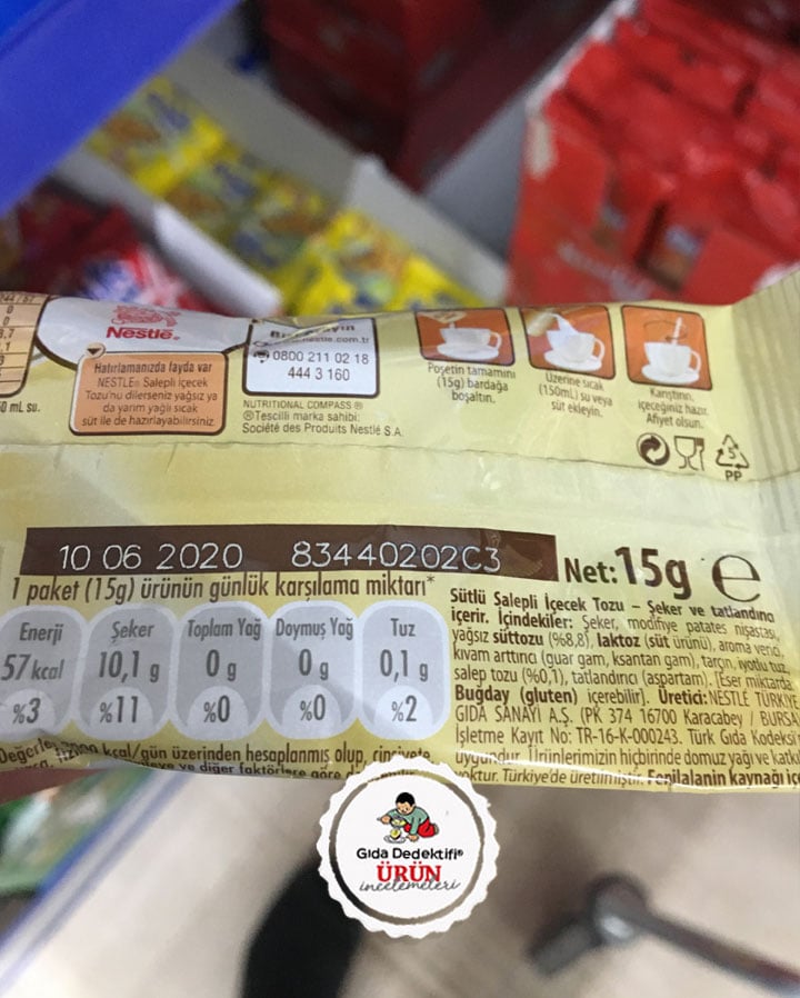 Kışın gelmesiyle sorulan ürünlerden biri de; Salep. Fakat market raflarında birçok markaya ait “Salep” ifadesiyle gördüğümüz ürünlerin neredeyse tamamında bindelik oranlarda salep tozu içeren ve çoğunlukla katkı maddeleriyle üretilmiş ve tatlandırılmış ürünler karşımıza çıkıyor. Bu ürünlerden birini inceleyeceğiz; Nestlé Salep. Ürün 15 gr.’lık paketlerde yasal adıyla Sütlü Salepli İçecek Tozu olarak satılıyor.