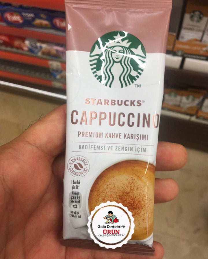 Fakat ürünlerin içeriği tahmin ettiğiniz gibi sadece Arabica kahveden – hatta öğütülmüş kahveden ibaret değil. Öyle ki; ürünlerde Starbucks şubelerinde kullanılan öğütülmüş kahvelerden ziyade, çözünebilir kahve kullanılıyor. Bunlar Starbucks tarafından mı tedarik ediliyor yoksa Starbucks bu üründe sadece markasını mı kullanıyor – onu bilmiyoruz. Etiket bilgileri doğrultusunda ilk olarak Starbucks Cappuccino Kahve Karışımına bakacağız. Ürün 14 gr.’lık paketlerde 3,45₺’lik fiyatıyla satılıyor.