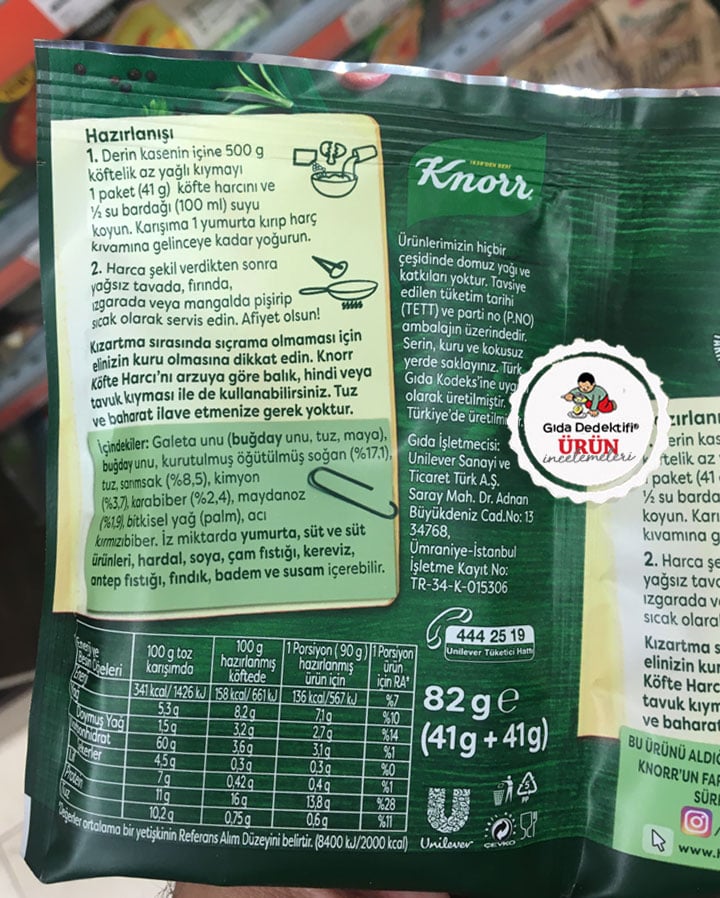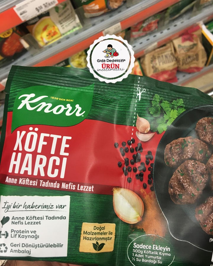 Ambalajında mayanoz, sarımsak ve kimyon ile köfte görselleri bulunan ve “Anne Köftesi Tadında Nefis Lezzet” ibaresiyle satışa sunulan Knorr Köfte Harcı ürününü inceleyeceğiz. Ürün 41 gr.’lık 2’li paketlerde toplam 82 gr.’lık ambalajlarda satılıyor. Ürünün ambalajında “doğal malzemelerle hazırlanmıştır” ibaresi yanında 500 gr. köftelik kıyma, yumurta ve yarım su bardağı su ile hazırlanan bir tarif de yer alıyor.