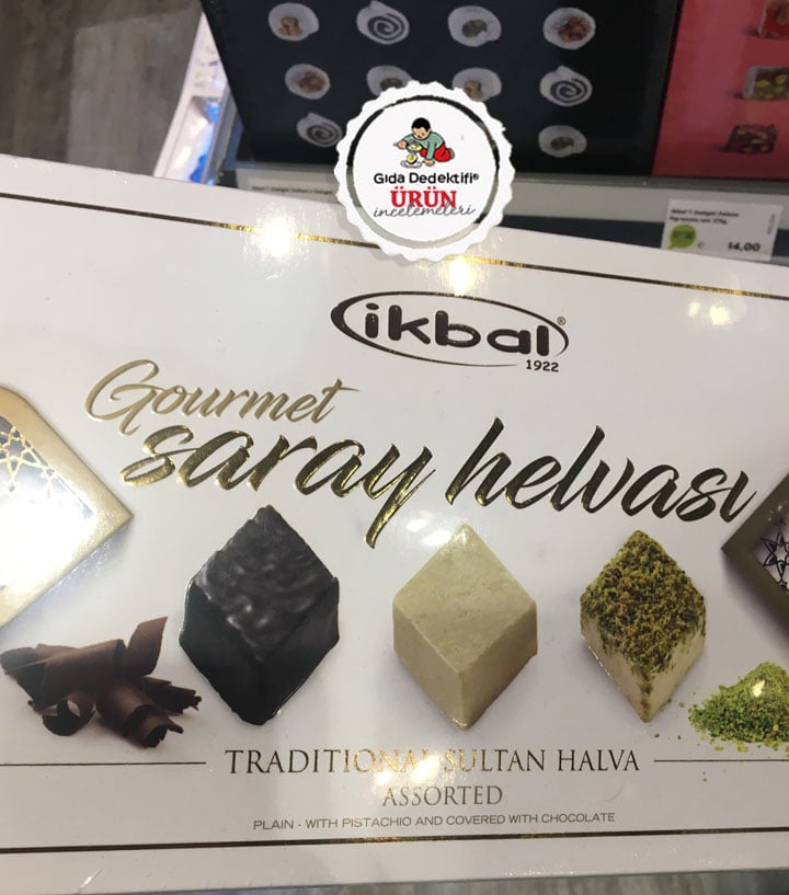 Aylar önce havalimanında denk geldiğimiz ve bir tweet ile takipçilerimize duyurduğumuz İkbal Gourmet Saray Helvası üçlü çeşidini inceliyoruz. Paket içinde çikolata kaplı, antep fıstıklı ve sade saray helvası yer alıyor. Ürün “Gourmet” ve “Traditional” yani “Gurme” ve “Geleneksel” ifadeleriyle satılıyor. Ürün içeriğinde geleneksel yağlarımızdan palm yağı elbette başrolde bulunuyor. Ürün geleneksel yağlarımızdan tereyağının ise tadı ve kokusunu veren yapay aroma verici içeriyor.