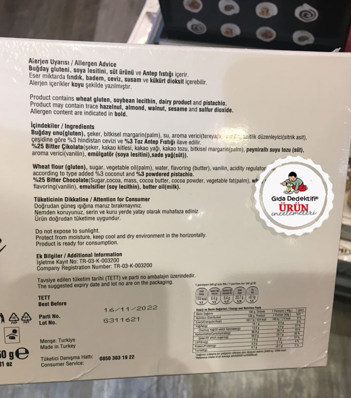 🔎İçindekiler: Buğday unu, Şeker, Bitkisel yağ (Palm), Su, Aroma verici (Tereyağı, Vanilin), Asitlik Düzenleyici (Sitrik asit), Hindistan Cevizi ya da Antep fıstığı (%3), Bitter Çikolata (%25) [Şeker, Kakao kitlesi, Kakao yağı, Kakao tozu, Bitkisel margarin (Palm), Peyniraltı suyu tozu, Aroma verici (Vanilin), Emülgatör (Soya lesitini), Sade yağ]